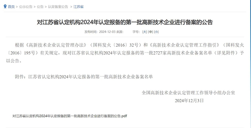 12月3日,全國高新技術(shù)企業(yè)認(rèn)定管理工作領(lǐng)導(dǎo)小組辦公室正式公告了江蘇省2024年認(rèn)定報(bào)備的第一批高新技術(shù)企業(yè)備案名單,中集安瑞環(huán)科技股份有限公司(以下簡稱“中集環(huán)科”)憑借其在技術(shù)創(chuàng)新、知識產(chǎn)權(quán)、產(chǎn)品研發(fā)及轉(zhuǎn)化等方面的卓越表現(xiàn),再次成功獲得國家高新技術(shù)企業(yè)資質(zhì)認(rèn)定,證書編號為GR202432000848。